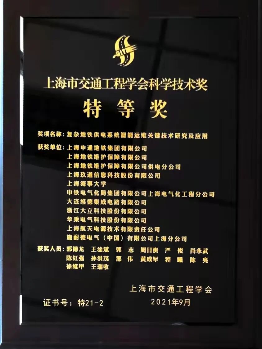 近日,上海市交通工程学会科学技术奖2021年评比结果揭晓,玖道科技联合上海申通地铁集团有限公司、上海地铁维护保障有限公司、上海地铁维护保障有限公司供电分公司、 上海海事大学等多家单位申报的《复杂地铁供电系统智能运维关键技术研究及应用》项目斩获“上海市交通工程学会科学技术奖特等奖”。本次获奖项目主要涉及玖道科技在供电智能运维方面的理论创新与技术突破。